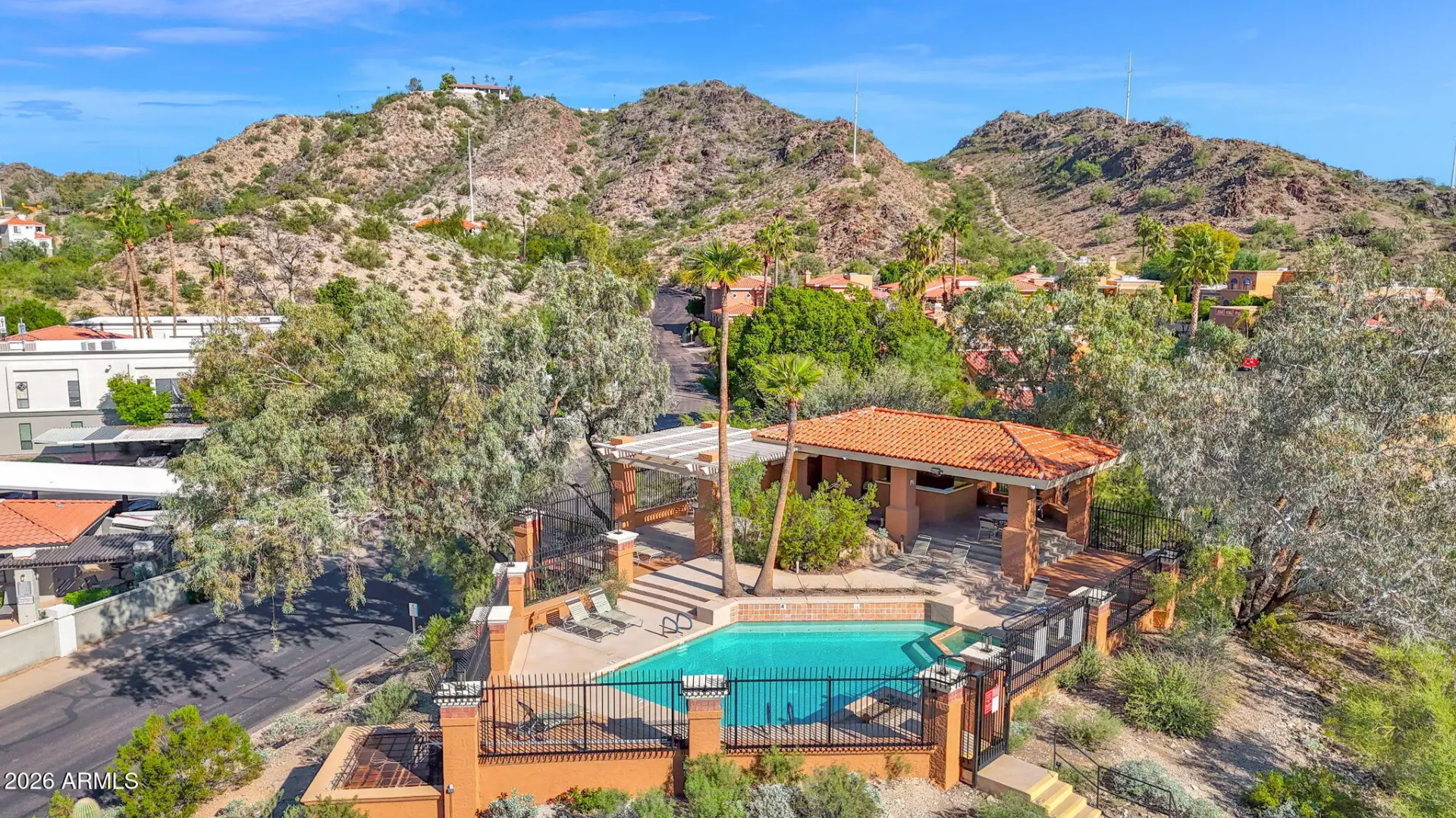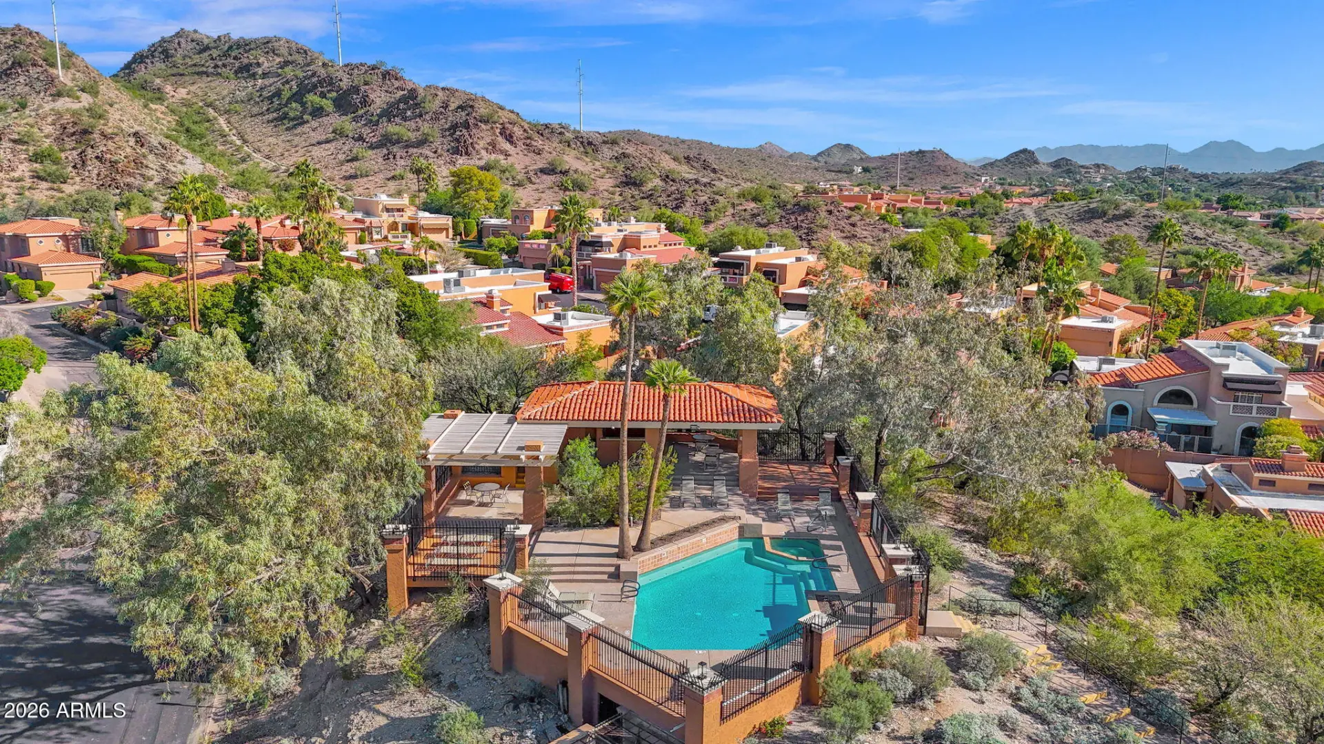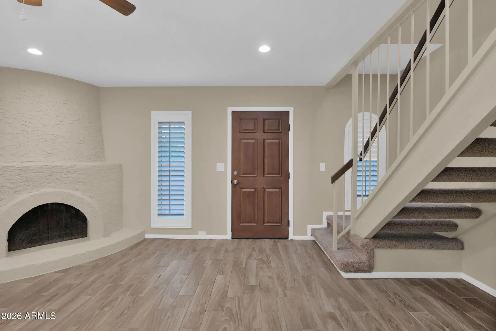 Charming 2-bedroom, 1.5-bath home located in the desirable Pointe Tapatio community, offering true resort-style living with multiple sparkling community pools. This move-in-ready residence features an updated kitchen with granite countertops, white shaker-style cabinetry, stainless steel appliances, and recessed lighting. Neutral ceramic wood-look tile flooring enhances the main living areas, while plantation shutters throughout add timeless appeal. Adobe fireplace. The half bath includes a stylish pedestal sink, and major updates include a newer 13-SEER A/C unit (2023). French doors open to an oversized private patio and side yard—perfect for outdoor entertaining. Upstairs offers two generously sized bedrooms; the primary suite features double closets and French doors leading to a privat
