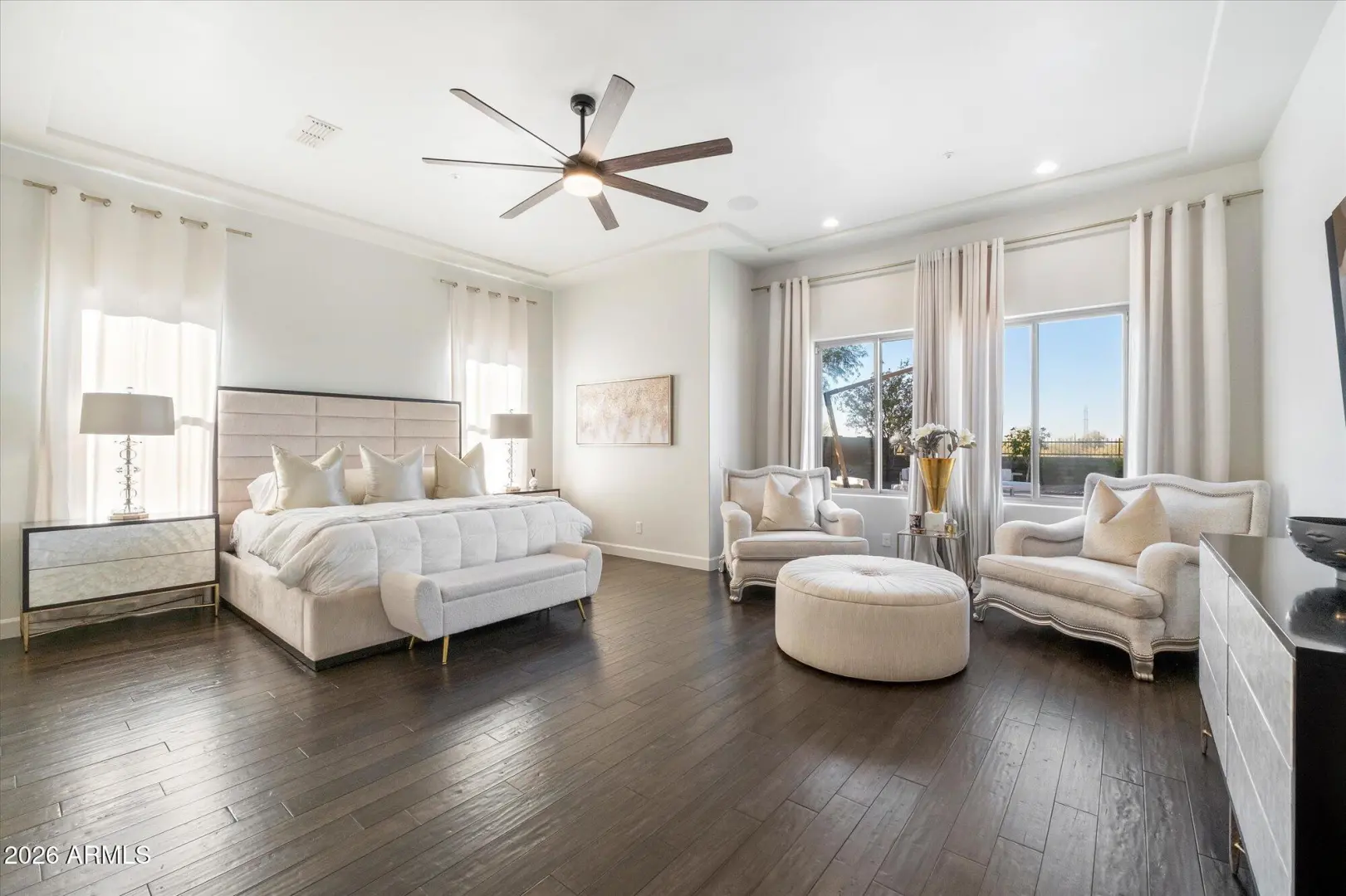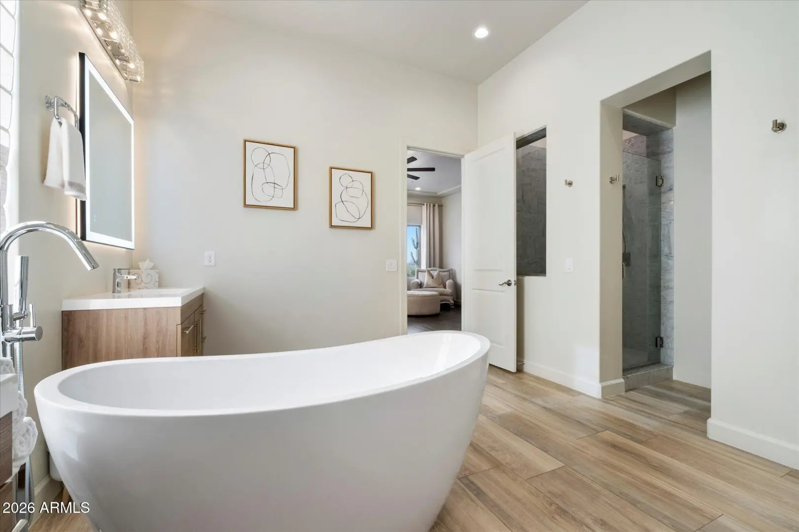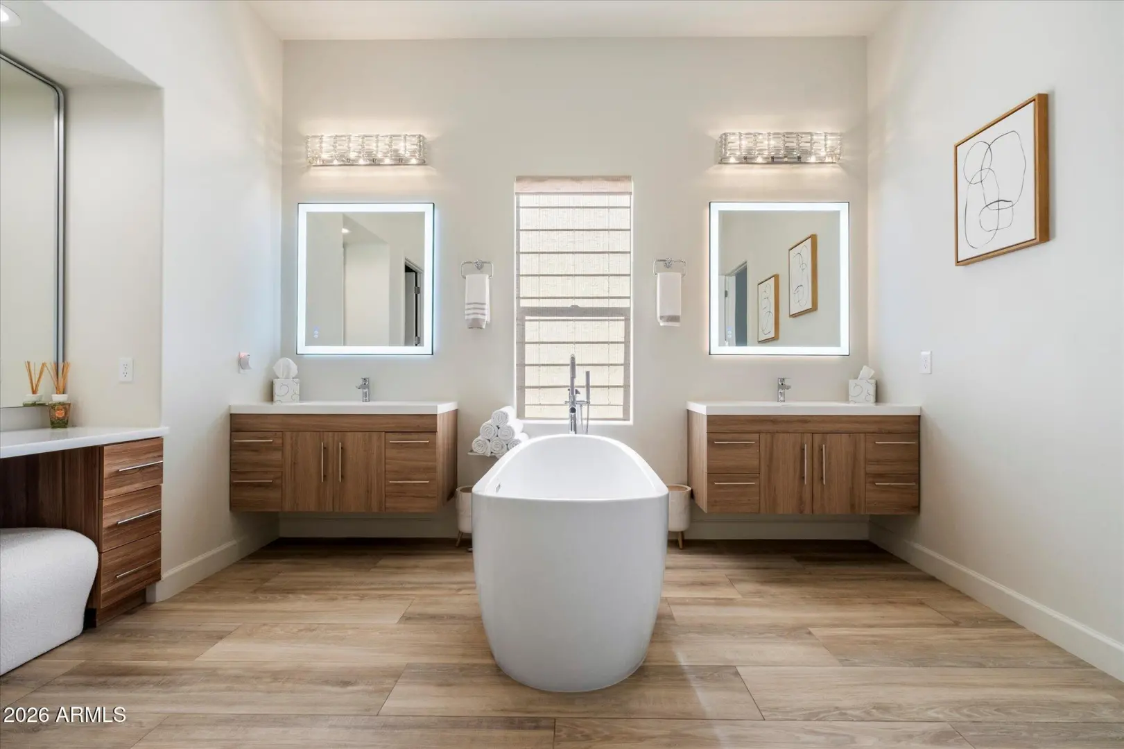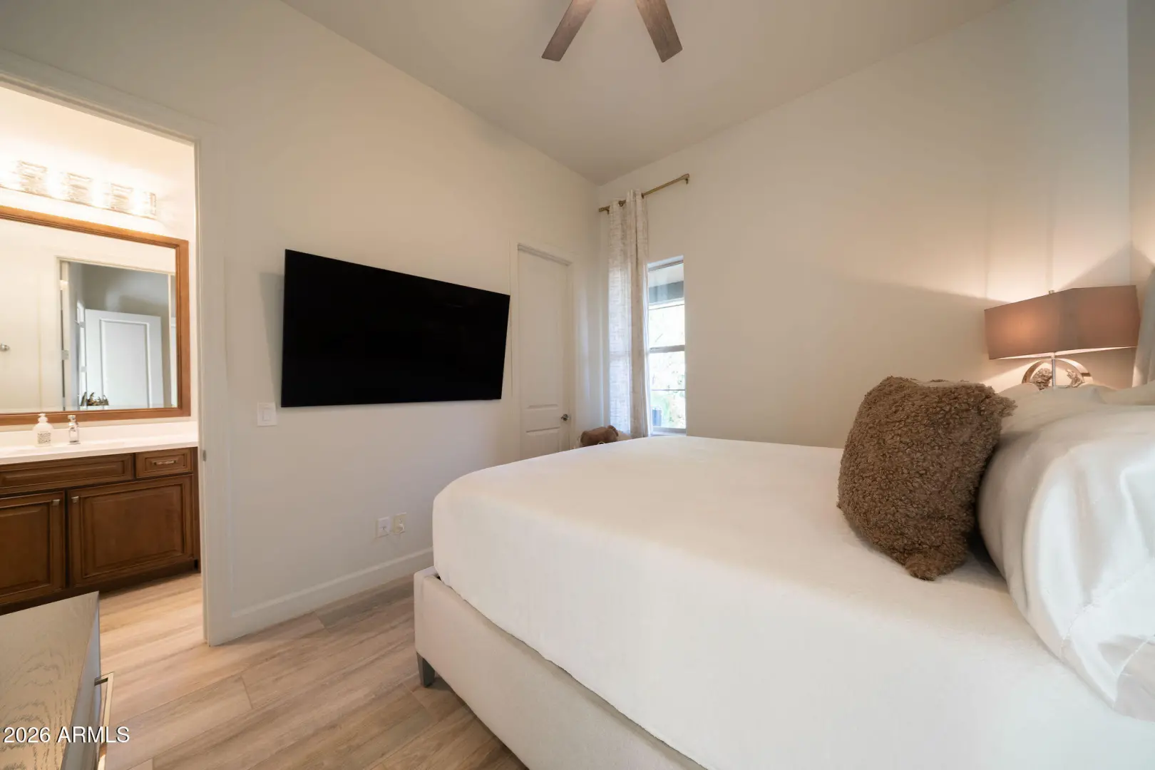 A stunning single-level home nestled in the exclusive gated community of Bocara, backing up to NAOS desert views. Privacy and fine living to include a 264 sq ft casita/Office by the front entrance. Beautifully paved courtyards; open, zero-grade floor plan designed for modern living and elegant indoor and outdoor entertaining. The chef's kitchen features top-of-the-line Dacor professional appliances and a striking quartz island and in addition custom clear Alder plantation shutters to enhance the natural light and aesthetic. The spacious primary suite is a true retreat with Carrera marble finishes and an expansive walk-in closet. The backyard is an entertainer's dream, featuring a sparkling pool, pergola-covered BBQ, built-in fire pit, and clear open views. NOT TO BE MISSED.