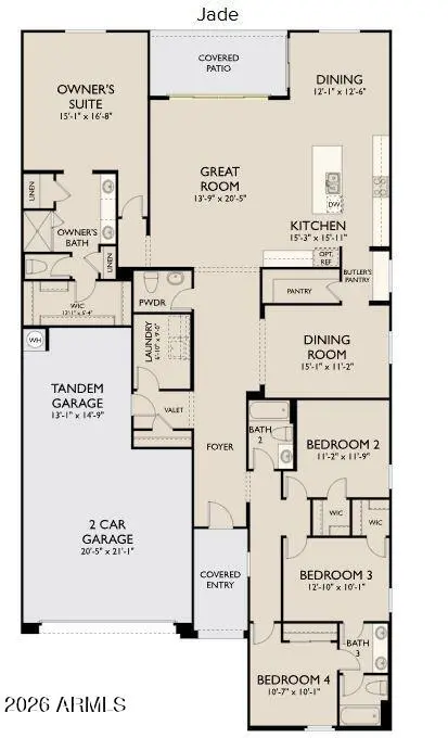 Introducing the beautifully designed Jade Plan featuring 4 bedrooms, 3.5 baths, and a spacious 3-car tandem garage. This thoughtfully designed split floor plan offers both privacy and functionality, ideal for modern living. The heart of the home showcases the Harmony Collection interior color package, highlighted by elegant white 42'' shaker cabinets, complementary finishes, and a classic, warm palette that blends seamlessly with any style. The open-concept layout flows effortlessly into a separate dining room, while the well-appointed kitchen features a convenient butler's pantry and a large walk-in pantry, providing exceptional storage and prep space, perfect for entertaining. The private primary suite is tucked away from the secondary bedrooms, creating a serene retreat. With elegant