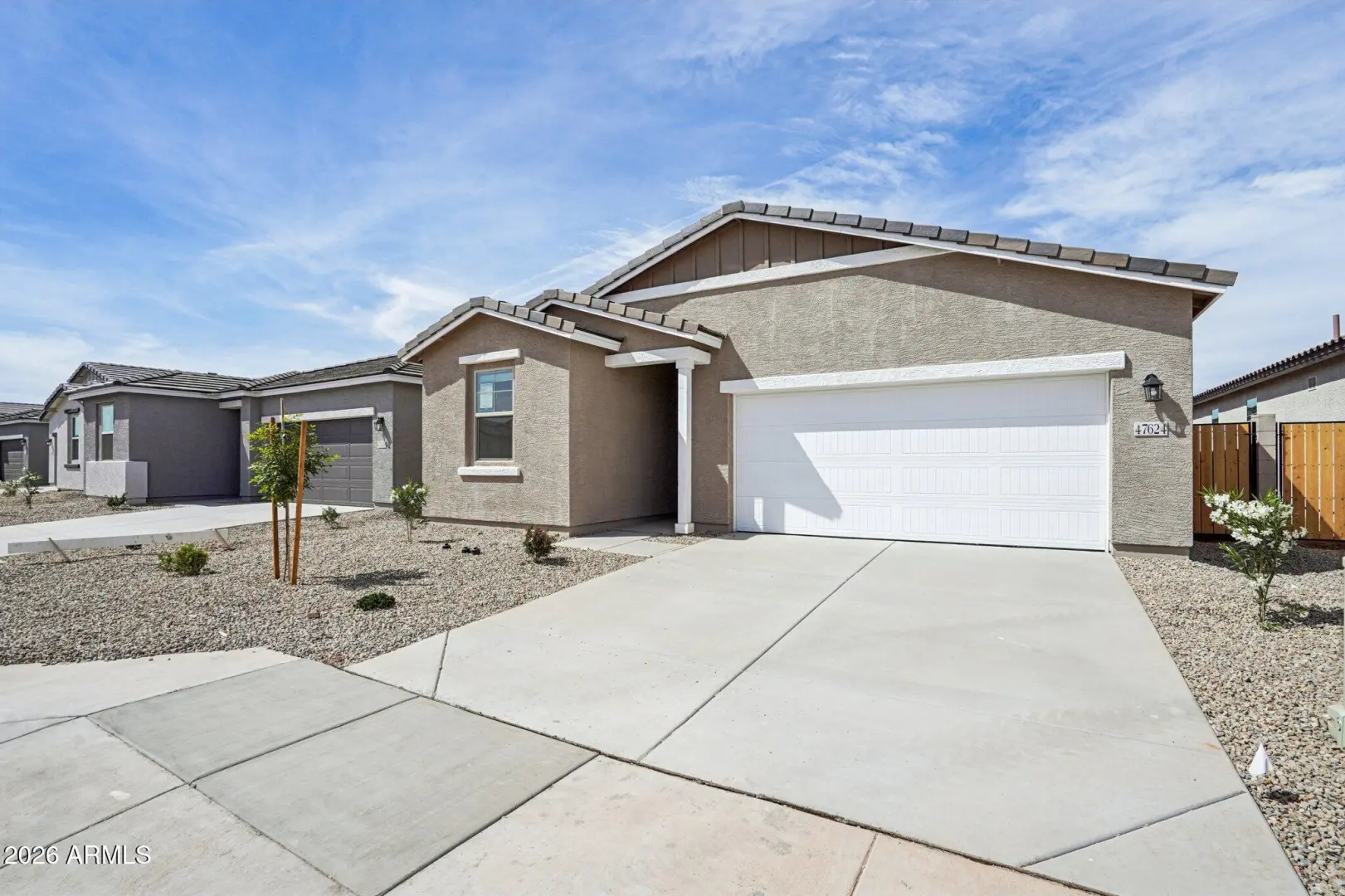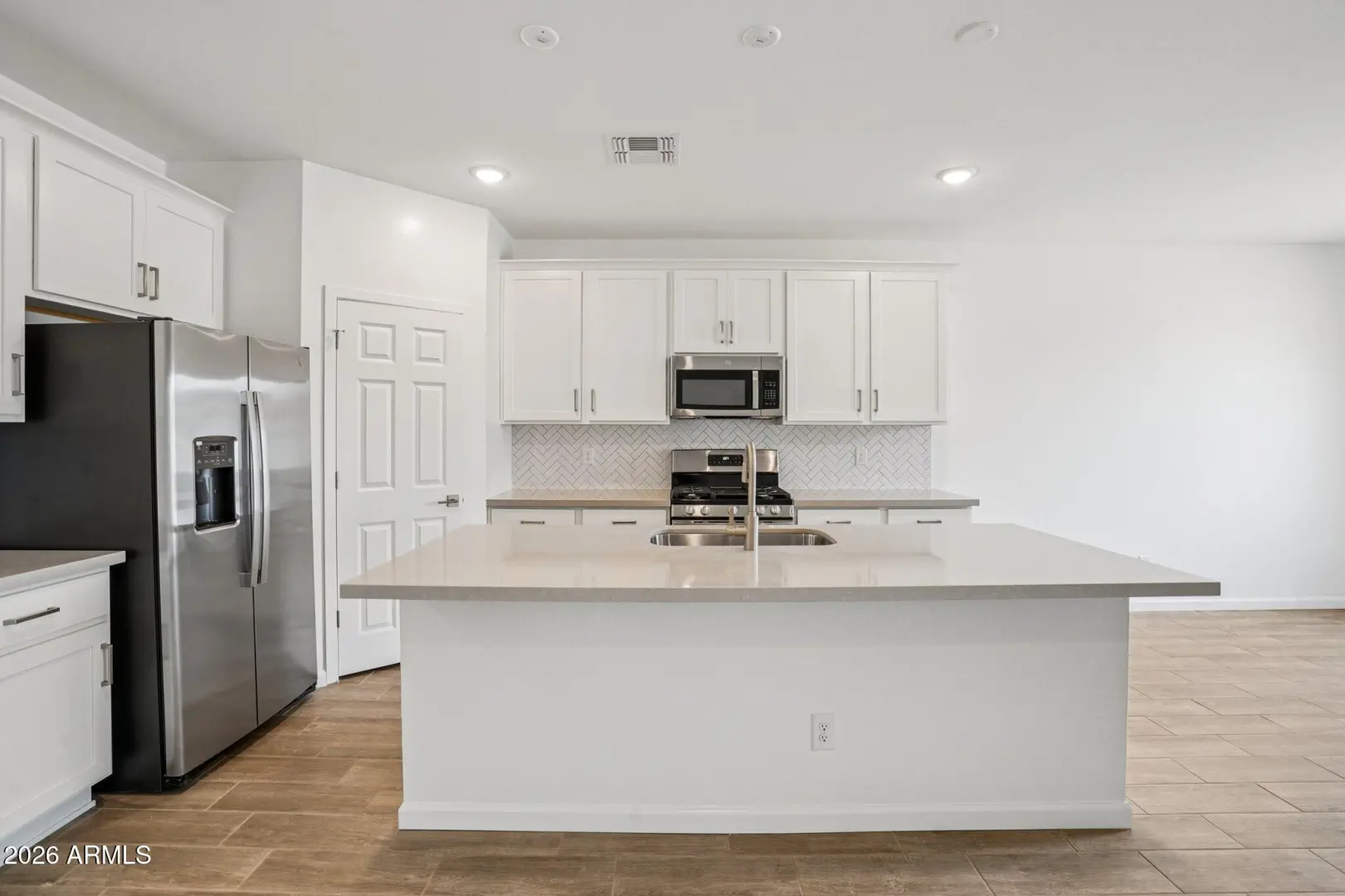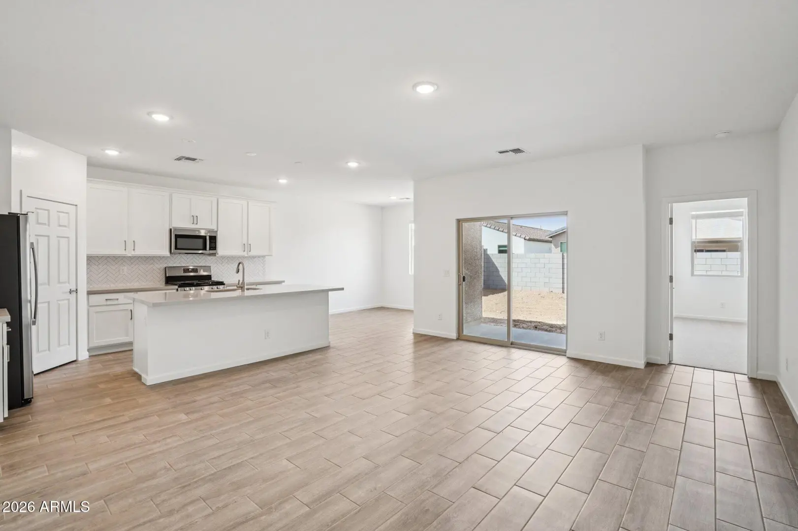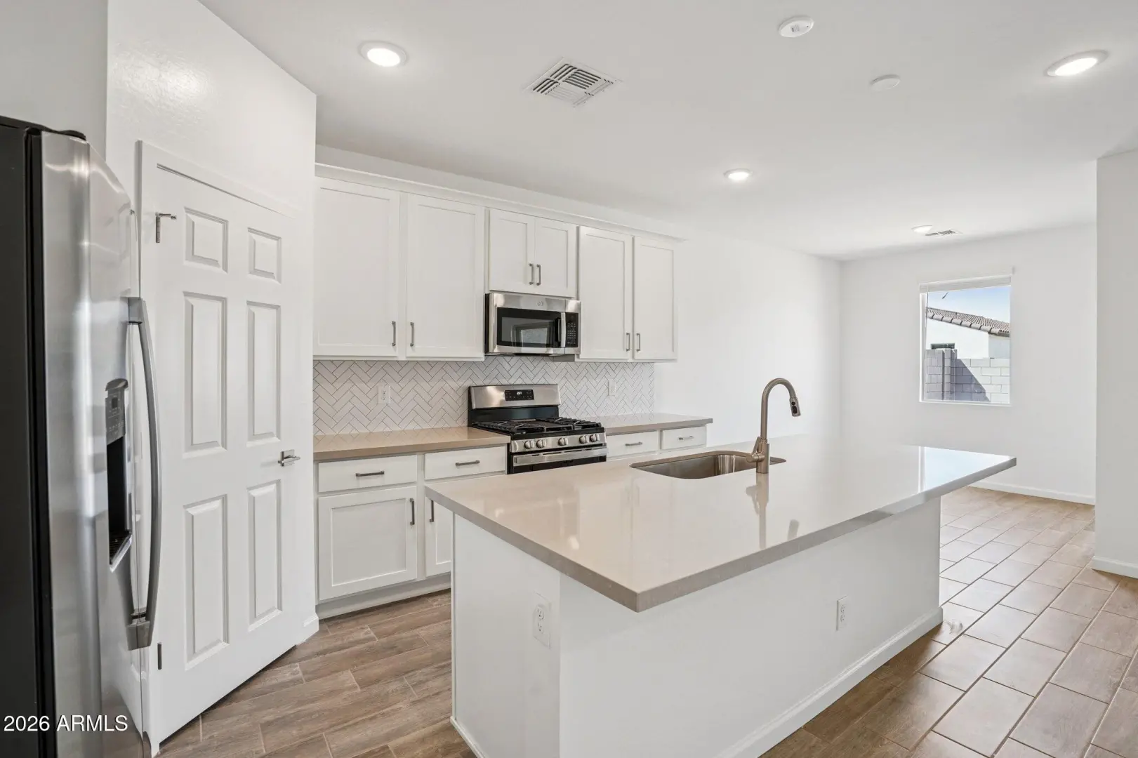 This home is ideal for first-time buyers, the Iris floor plan offers 1,797 sq ft of living space, 4 bedrooms, 2 bathrooms, a 2-car garage, and a large backyard. The kitchen features 42''white cabinets, beautiful Ivory White quartz countertops, a Artic White 1x3 chevron-patterned backsplash, and satin nickel hardware to tie it all together. This Iris comes fully equipped with stainless steel appliances, including a gas range, microwave, dishwasher, fridge, plus a white washer and dryer. The designer-curated finishes are completed with 7 x 22 wood-look tile floors in the main living areas and plush carpeting in the bedrooms and den. Getting ready is easy in the primary suite, which features dual sinks, a shower with a glass door, and a large walk-in closet. This Iris floor plan als