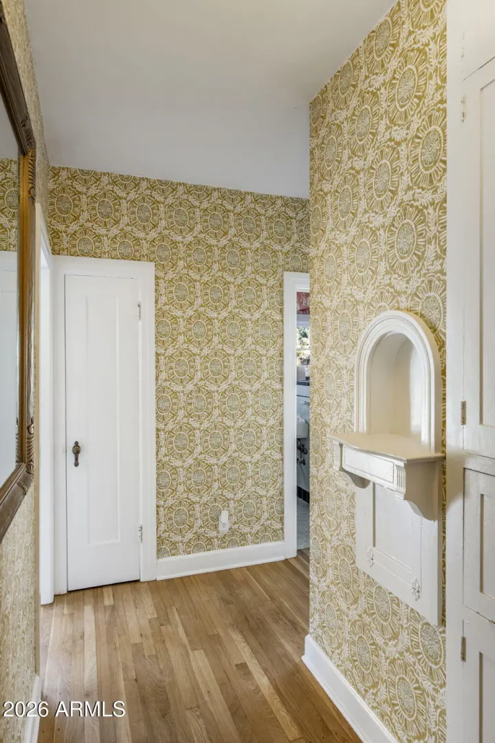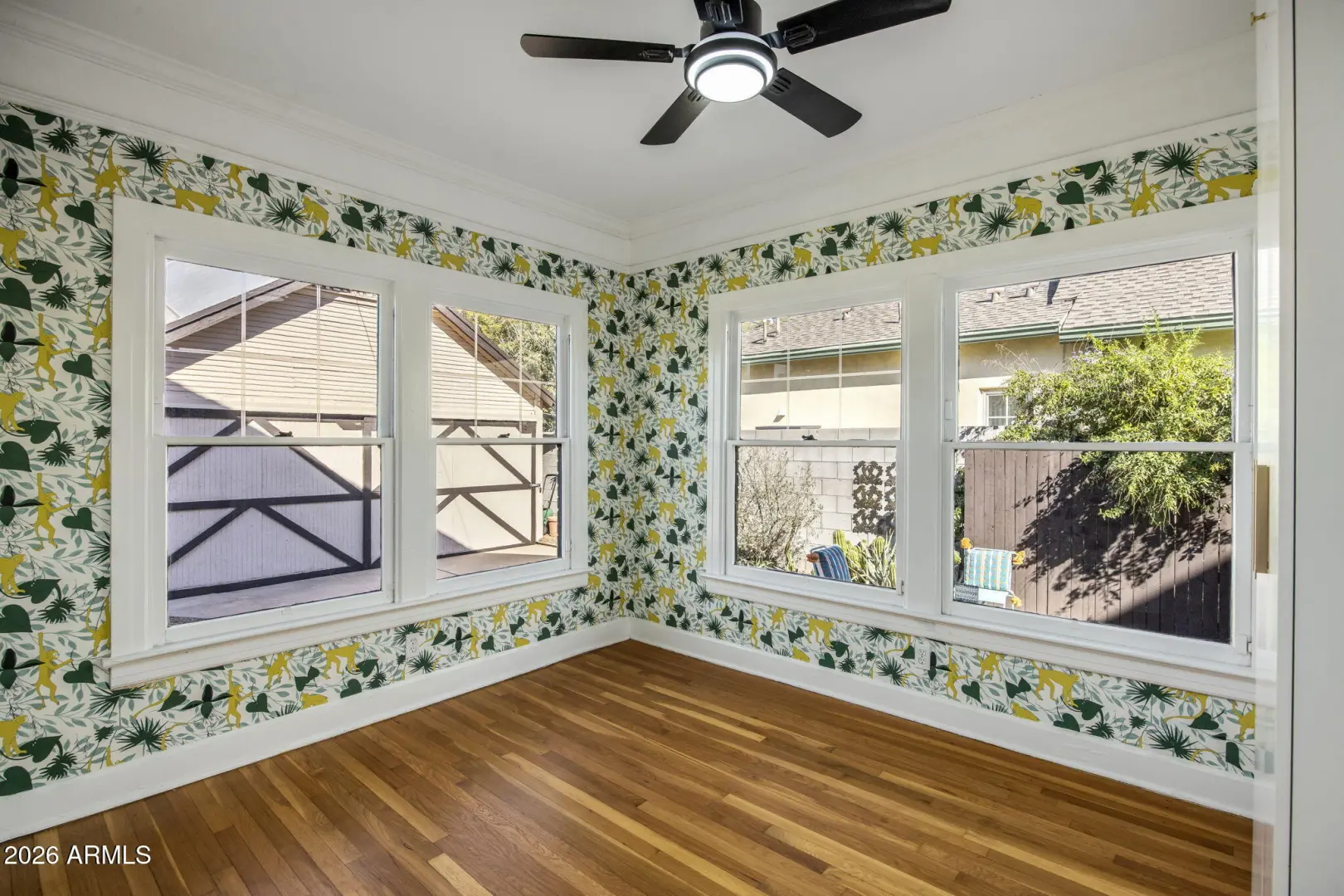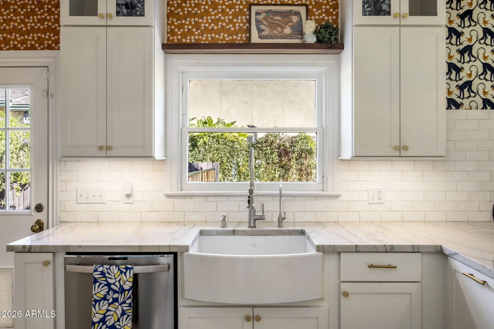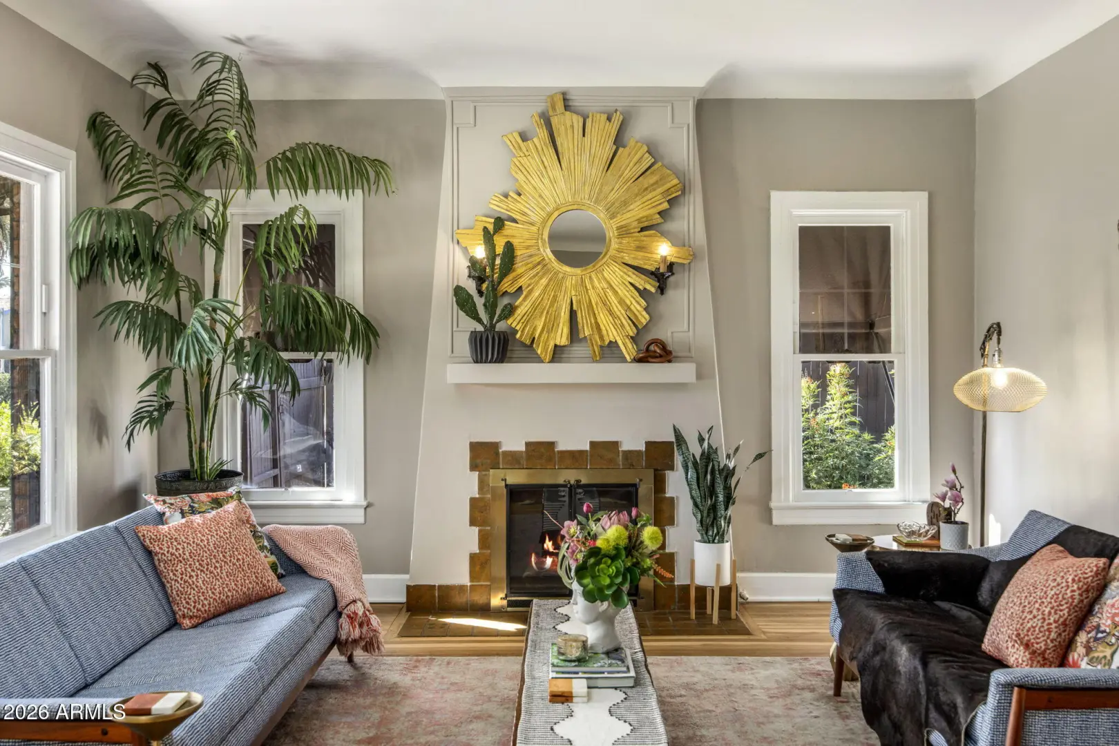 Classic 1930s Tudor Revival on one of the most charming streets in the Willo Historic District! This 3 bedroom home offers original details such as red oak floors, coved ceilings, chandeliers, and a phone nook. The formal living room has a gas-converted fireplace, while the modernized eat-in kitchen features Carrara marble counters, a stainless steel gas range, dishwasher, wine cooler, and refrigerator. One bedroom includes a custom California Closets system. The lush backyard offers fruit trees plus a 2 car garage with plumbing and electricity. Gutters, awnings, and wood fencing were updated in 2024. Located in one of the friendliest, most walkable and bikeable neighborhoods in Midtown Phoenix, just minutes from coffee shops, restaurants, light rail, hospitals, and freeway access.