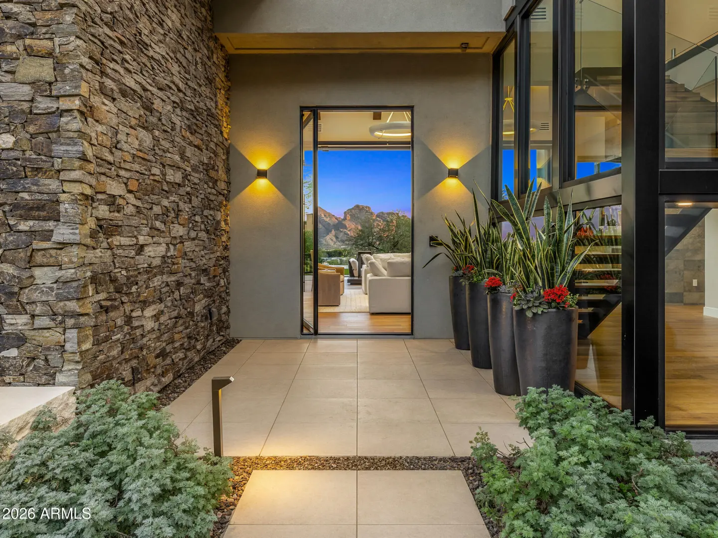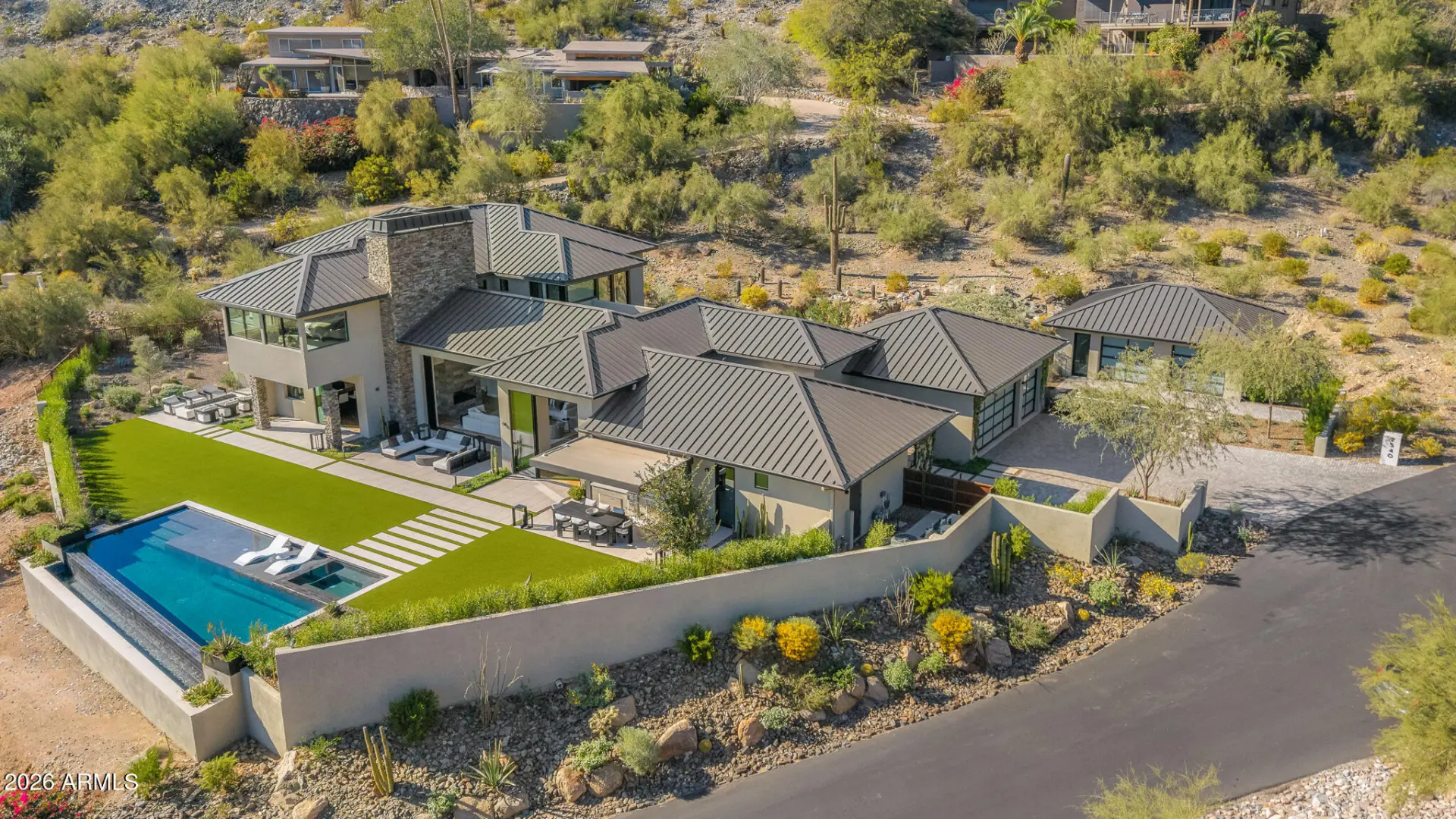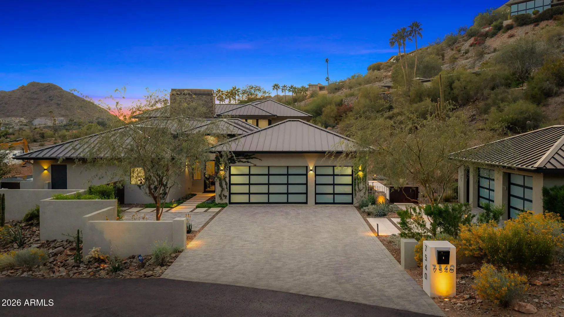 Extraordinary modern home with an extraordinary vantage point of Paradise Valley. Perched high within the prestigious guard gated enclave of Clearwater Hills, this dramatic modern hillside estate captures sweeping, unobstructed views of shimmering city lights and iconic Camelback Mountain. Bold architecture, featuring a dramatic fireplace, a floating staircase, and walls of glass, frames the breathtaking scenery. Thoughtfully designed, the split floor plan delivers both grandeur and livability. The front walkway, featuring a tranquil water feature and meticulous landscaping, is the ''welcome home'' you've been waiting for. The residence offers five bedrooms, two private offices, a spacious game room, and an impressive full-service bar designed for elevated entertaining. At the center of